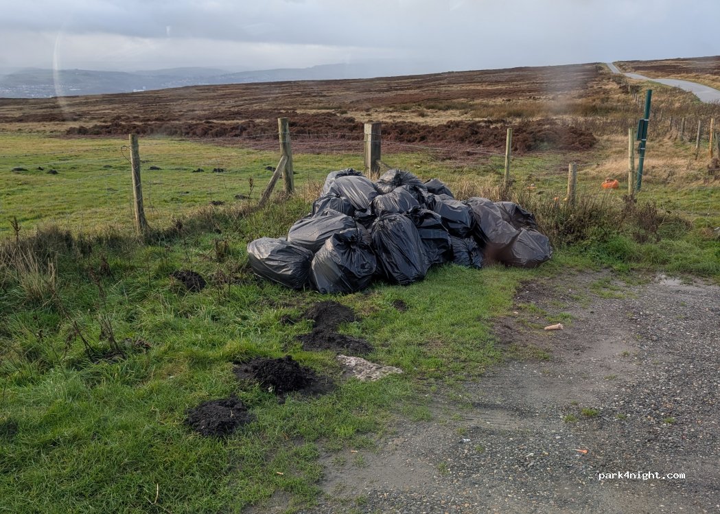 Great park up!! This is a dead end road, no through traffic. It Was empty at six pm when I arrived. One or two cars came up during the evening, stopping a few mins then leaving. I slept soundly all night. Few dog walkers late morning. Nice n chilled views of the Misty moors. A small bin is the only facility.