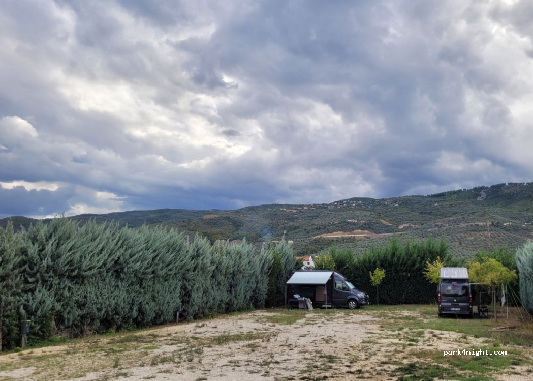 Aire pratique, toilette douche, clôturé, parfait quand on a des chiens! Nous avons été manger au restaurant, bon, par cher et le patron est super sympa, raki offert à la fin! Et si vous avez besoin d’huile d’olive, il en vend, et c’est l’une des meilleures huiles d’olive que nous avons goûté (6€ le litre)