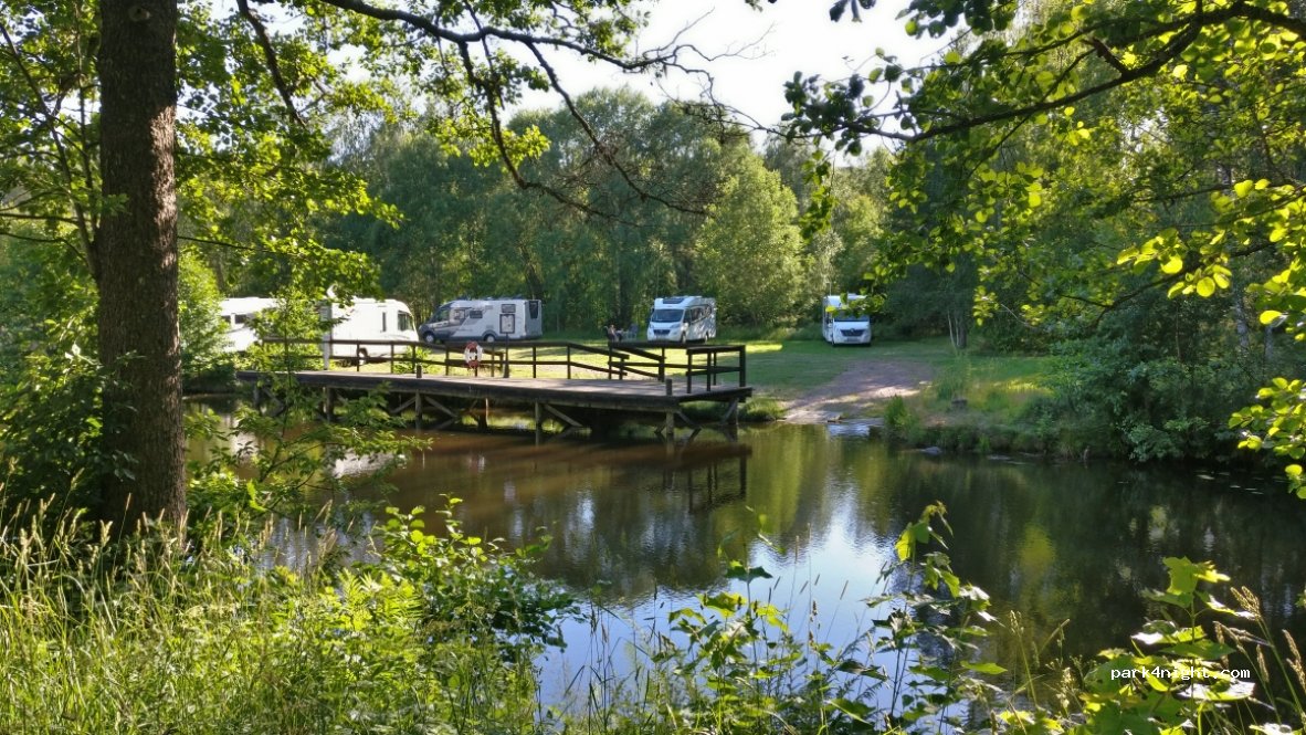 Väldigt fint bredvid ån. Egna platser för 4 st stora husbilar. Gräsmatta. Parkeringsförbud på vanliga parkeringen på kvällen.