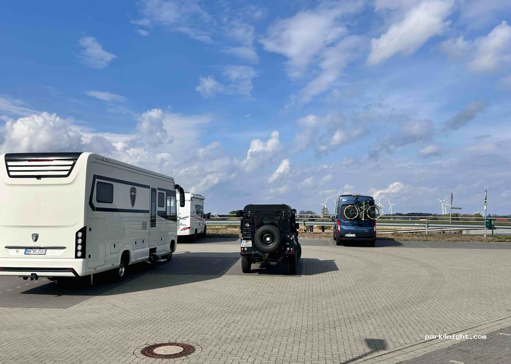 Ausreichend Platz, wundervoller Blick auf die Elbe. Tagsüber Straßenverkehr und entsprechende Geräuschkulisse, nachts aber ruhig. Teilweise halten sich Jugendliche mit ihren Autos auf dem Parkplatz auf, verhalten sich aber weitestgehend ruhig.