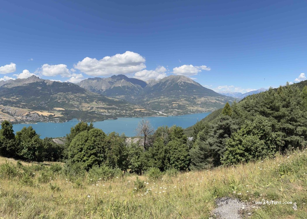 Une vue imprenable sur le lac de Serre-Ponçon ! Un coucher de soleil, magnifique. Un endroit calme et propre, quelques randonneurs le matin. Seul petit bémol la montée du chemin pour y accéder beaucoup de cailloux et de Pierre. Éviter en camping-car fourgon OK. Attention de pas être trop lourd.