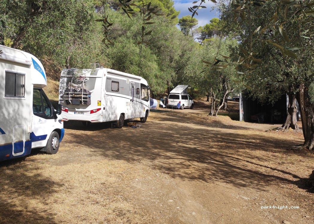 Emplacement non délimiter au milieu des oliviers faire attention a la hauteur .route étroite attention au croisement de vehicule . Adhérent veuillez descendre au village à 400m en dessous pour vous enregistré au propriétaire du magasin.