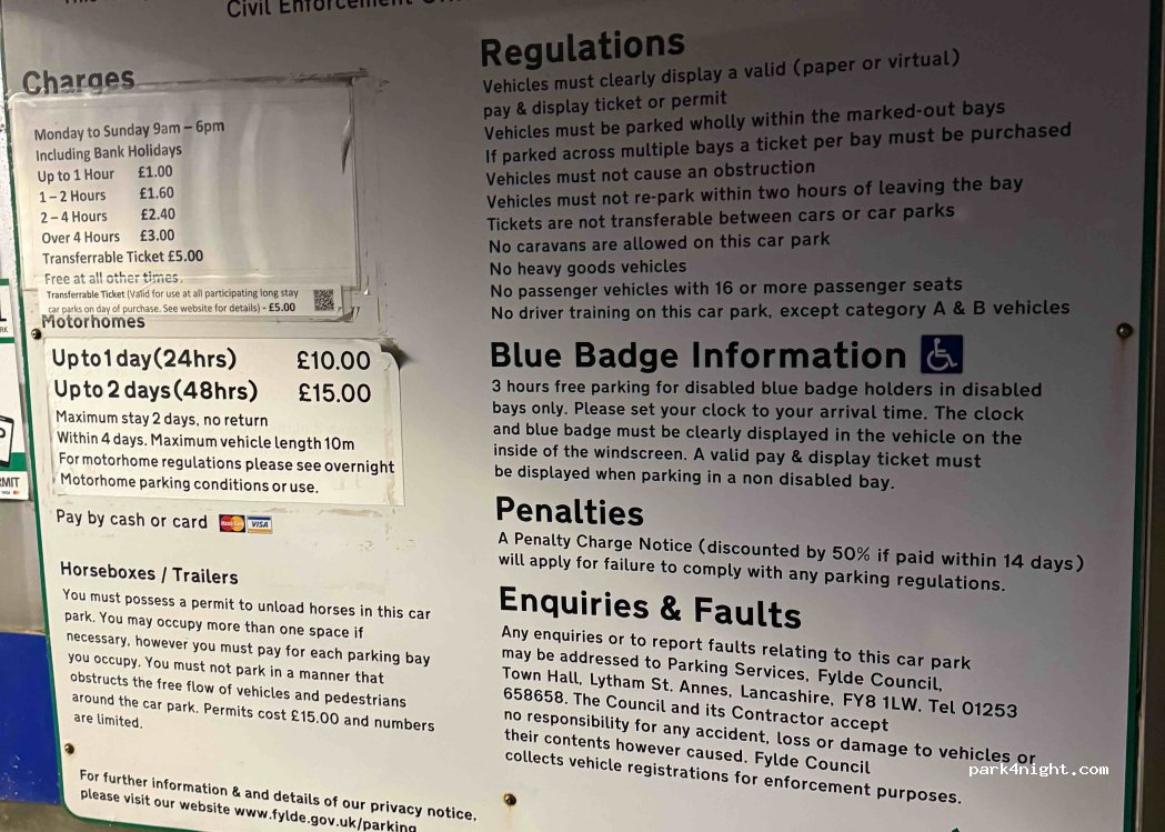 Nice quiet stopover with easy access to the beach. The surrounding area is nice (seems affluent). 10 bays with a slight slope. Shop/Indian/Chinese/chippy 15 min walk. St annes is a 20 min walk. Blackpool tram stop is a 30 min walk. £10 for 24hr/£15 for 48 hours.