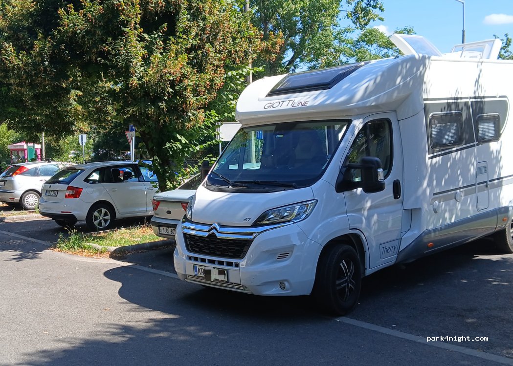 Miejsce do spania bardzo dobre, spaliśmy 2 noce. Nie do biwakowania. Parking pod drzewami, więc można stanąć w cieniu. Zmieściliśmy się krótkim VW Crafter, ale na duży kamper nie ma miejsca. Najlepiej zaparkować przed 8:00 rano lub po 18:00. W dzień parking jest pełen. Miejsce w ciągu dnia bardzo uczęszczane przez ludzi i samochody - obok jest szkoła.