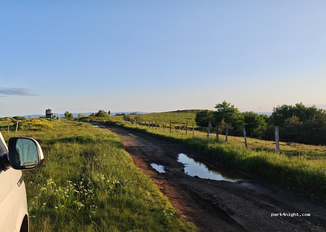 Le premier parking est situé vers une tour à eau il peut contenir jusqu'à 3 véhicules mais si vous allez tout droit dans le chemin qui descend vous trouvez un emplacement pour un véhicule un petit peu en pente mais la vue est imprenable. Au milieu des genêts et des myrtilles.