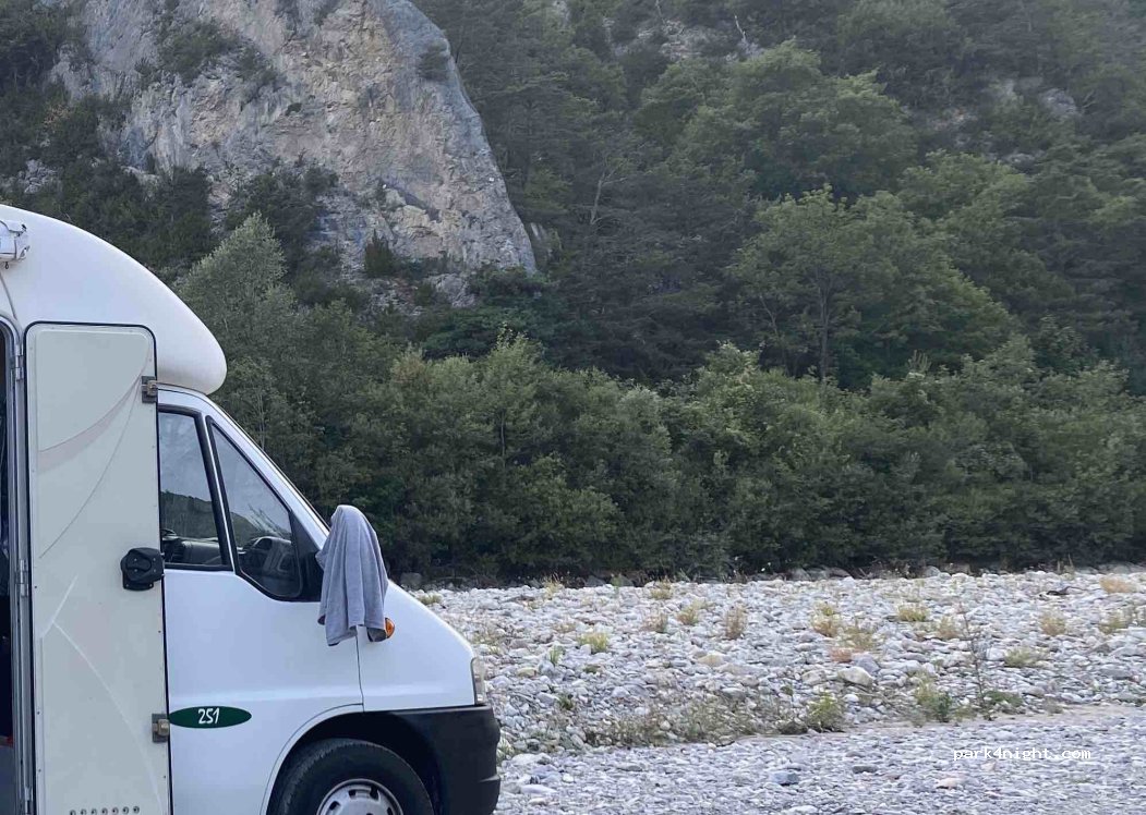 Beautiful spot by the river. Two flat parking spot. I bit noisy at night with the road