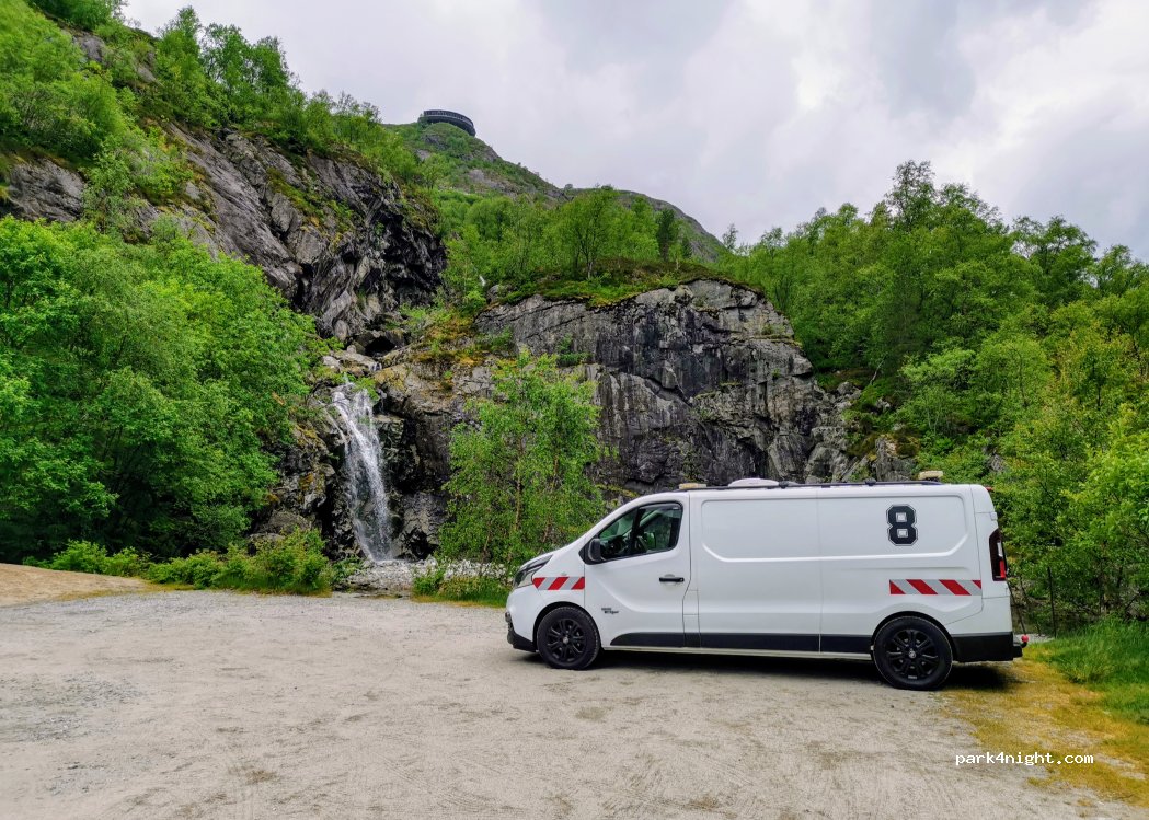 Parkplatz direkt am Wasserfall mit einem beruhigenden Rauschen im Hintergrund. Die direkt vorbeiführende Straße ist abends und nachts kaum befahren, insgesamt ruhig. Kann als Ausgangspunkt für die Wanderung zum Kjeragbolten genutzt werden, ca. 30min (auf der Serpentinenstraße) bis zum offiziellen Parkplatz.