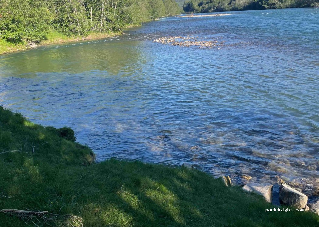 A lovely spot with a fireplace and a beautiful view of the river. You park right on the riverbank. The spot is next to the road, but it's quiet and peaceful. We only heard the sound of the river.