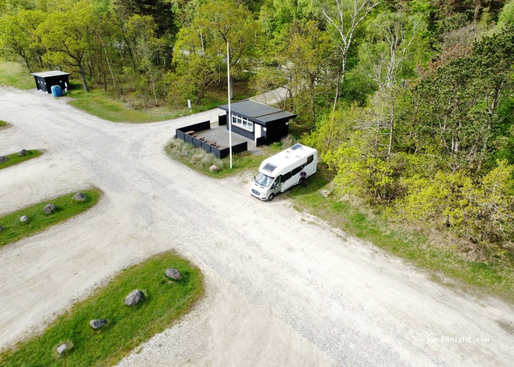 A very nice place, where you can stay overnight. The information given about this must be based on misunderstandings. As you can se on the board CAMPING is not allowed,(a tent and a wagon) but parking a camper is NOT camping and therefore allowed. I have known this place for years and stayed there last summer without problems. In Denmark you can park day or night and nobody cares if you sleep.