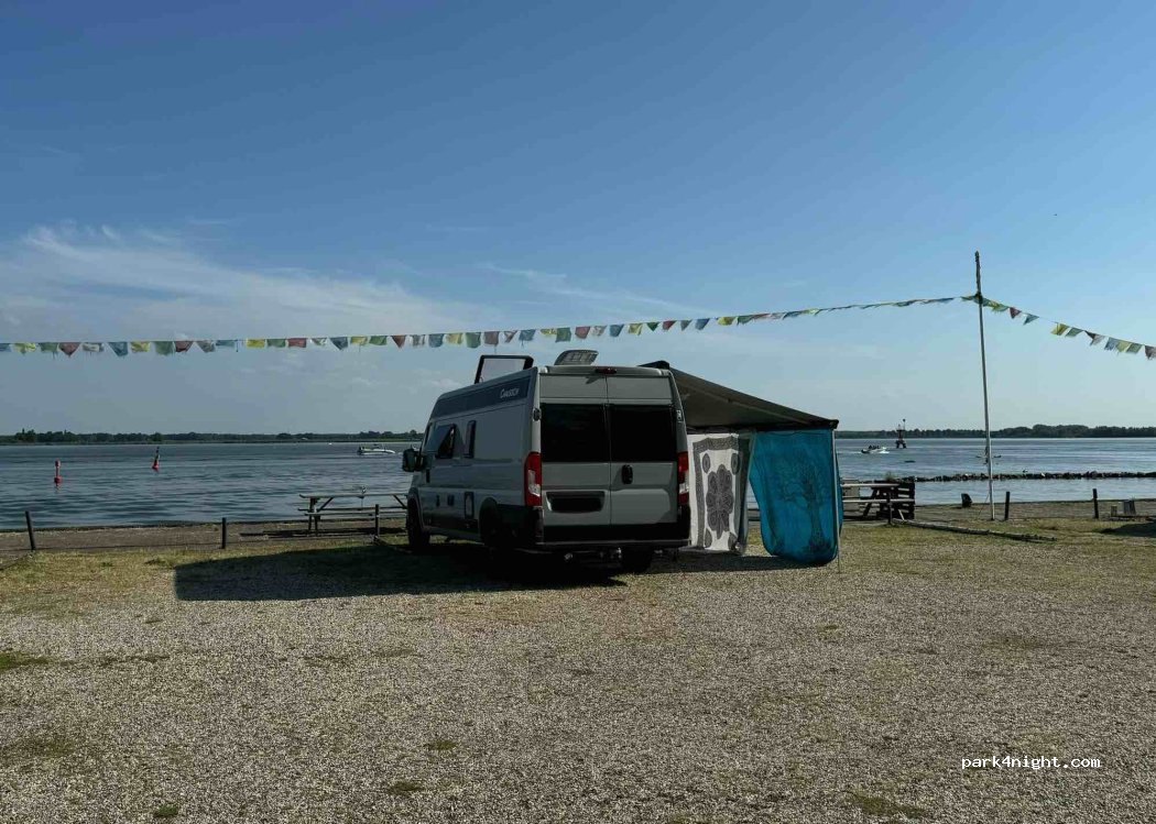 Arrivés vers 17h30 toutes les places face à la mer étaient déjà prises. Un endroit calme avec vue très agréable. A quelques mètres du camping aquacentrum où il y a snack et petite boutique de dépannage. Nous sommes accueillis par la personne en charge du parking. Personne très accueillante et agréable. Nous avons payé 14,50€ pour la nuit pour 2 personnes avec électricité. Le robinet d’eau ne fonctionnait pas. Seul petit bémol des nuages de moucherons un peu envahissants