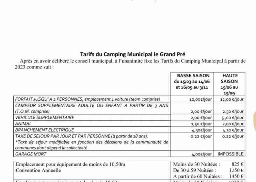 L’emplacement forfait 2 personnes + taxe de séjour 9.50 €. Services eau + vidange en supplément. Placement libre. Bien ombragé. Camping en contrebas de la route, un peu bruyant avec le passage des poids lourds. Accès direct à la rivière.