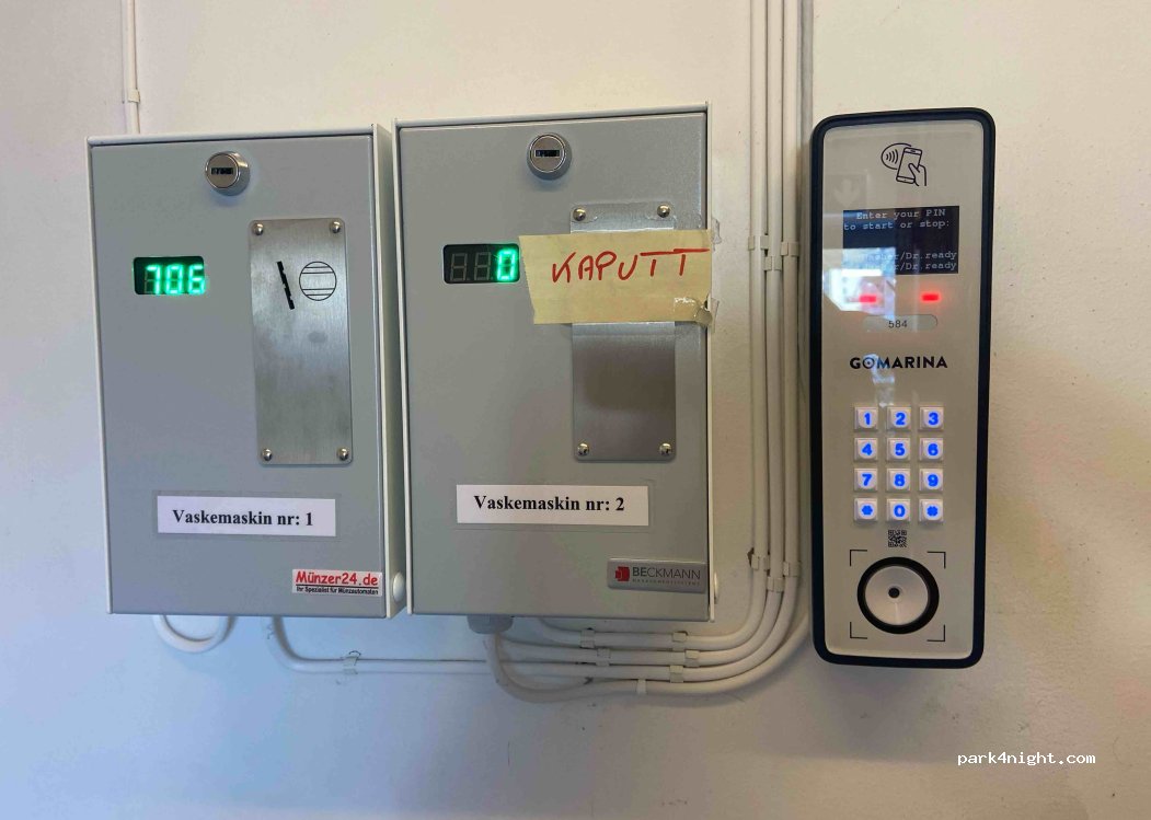 Es gibt 2 Waschmaschinen. Eine ist zur Zeit defekt. Außerdem sind 2 Trockner vorhandenen, die ganz normal trocknen, wenn man sie richtig bedient. Coins muss man in der Touristeninfo holen, 50 NOK pro Waschgang. Trockner kostenfrei. Parken in der nahen Umgebung 1h kostenfrei.