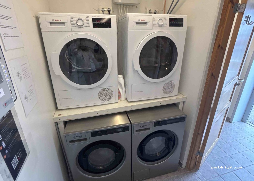 Nur zwei Waschmaschinen, die Trockner sind kostenlos und werden auch ohne Waschen genutzt. Wir haben Sachen gewaschen, konnten aber nicht trocknen. Jemand hat beide Trockner voll gestopft und auf zwei Stunden gestellt. Auf jeden Fall viel Zeit einplanen. Toiletten nicht sauber, aber in der Nähe gibt es Kulturhaus. Dort sind kostenlose, saubere, große Toiletten.