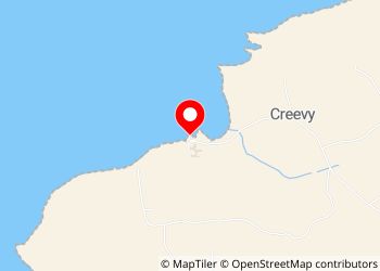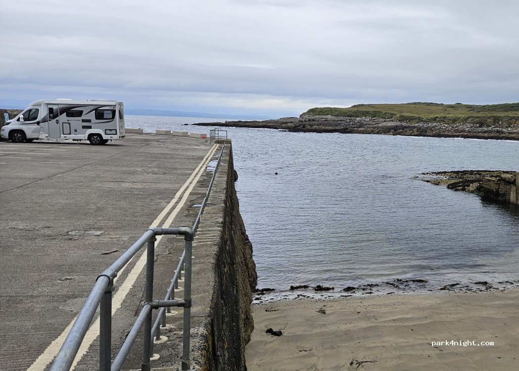 Creevy Pier. Marked out parking along sea wall. No problem to park and turn a 6m van - recently added very low rail to remind you that you are about to drive over the edge! Very (very) busy at high tide as local swimmers flock to the harbour & all seem to want to drive to the end of the pier. Alone later and so restful with a lovely sunrise.