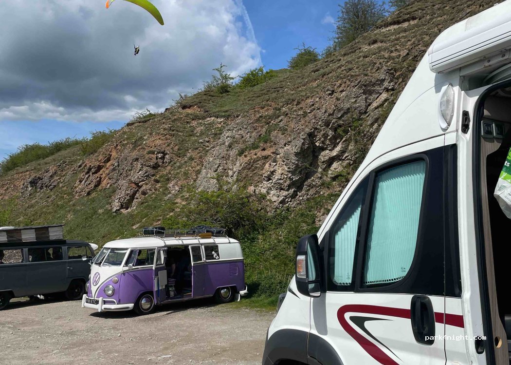 Beautiful, quiet hilltop road. Stayed on a Tuesday and had the hill to ourselves. Stayed the following Saturday = 14 vans and 4 cars. But still found space. Stunning wide, open hilltop views to wake up to. Not level. Can get windy. Nearest pub 20mins walk downhill (30mins back up).