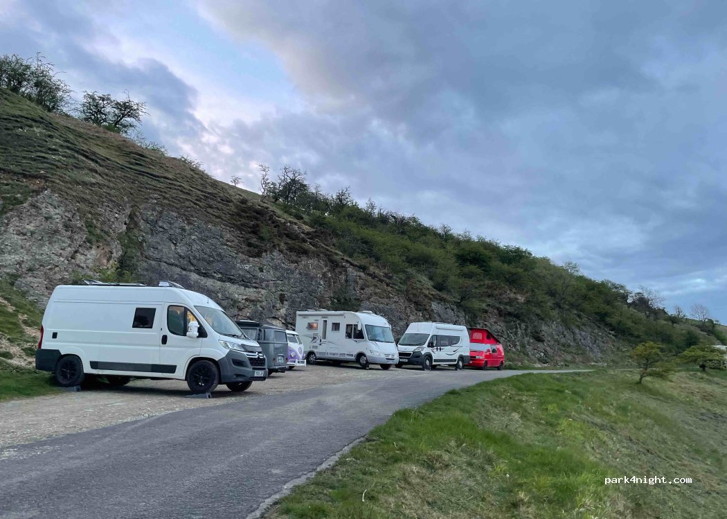 Stayed two nights here (driving away during the day). Pretty quite. Occasional car and cyclists. Surprised not spoilt by clowns in naff souped up cars….. but we saw police drive past twice, so think probably patrolled. Superb views. Great sun trap in the evening. Narrow lane to get there, but our wide 7m long Motorhome managed ok.