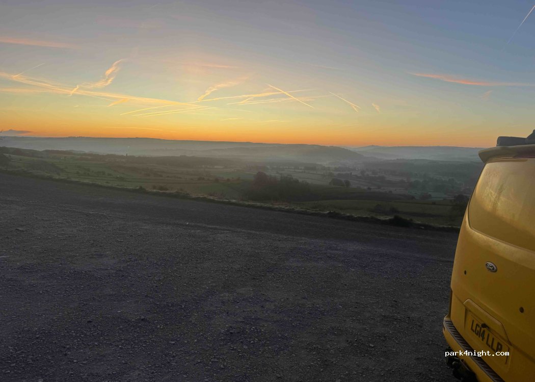 Large gravel laybys, enough space for lwb. Beautiful views over Peak District. Peaceful night.