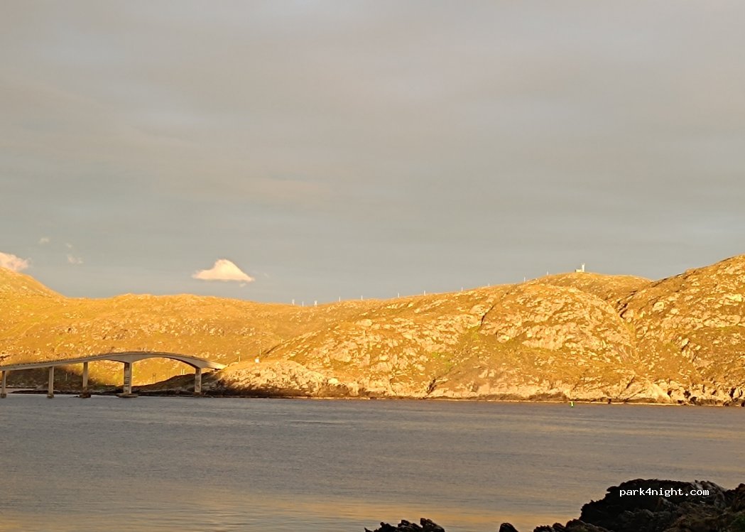 Free place at the end of dirty road. No facilities, a lot of mosquitos in summer. Nice view of the sea, islands and bridges. Enough space for big motorhomes, but watch the road, there's a lot of holes.
