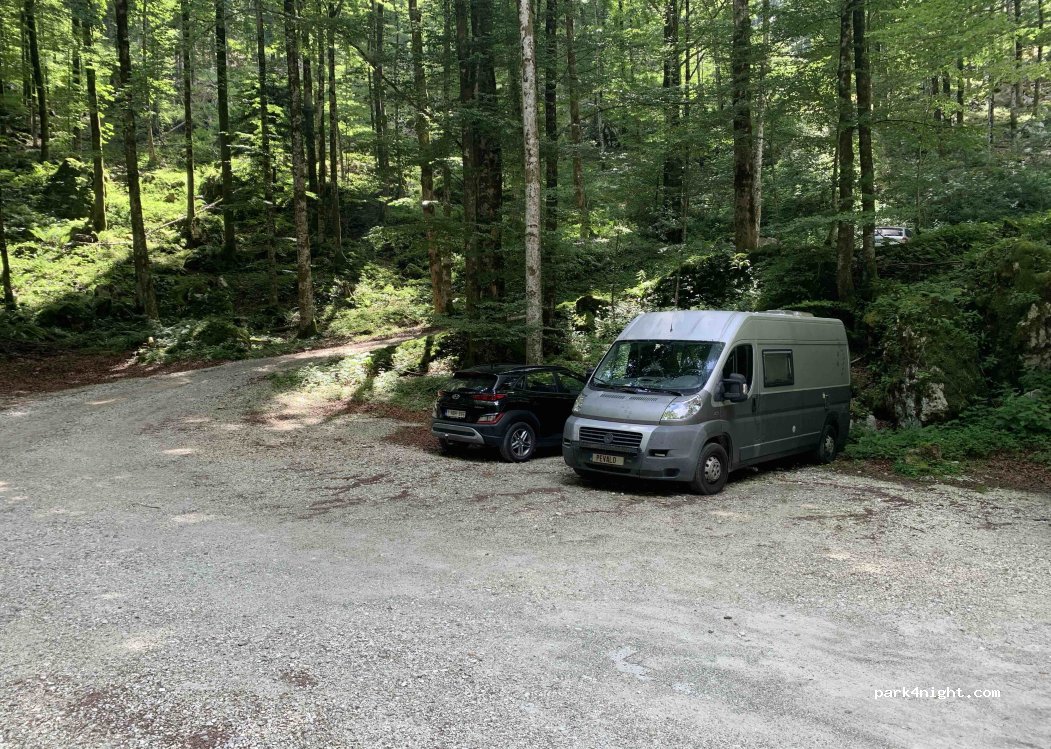 Parkplatz Savica-Wasserfall. Mehrere Plätze im Schatten. Nachts nicht.