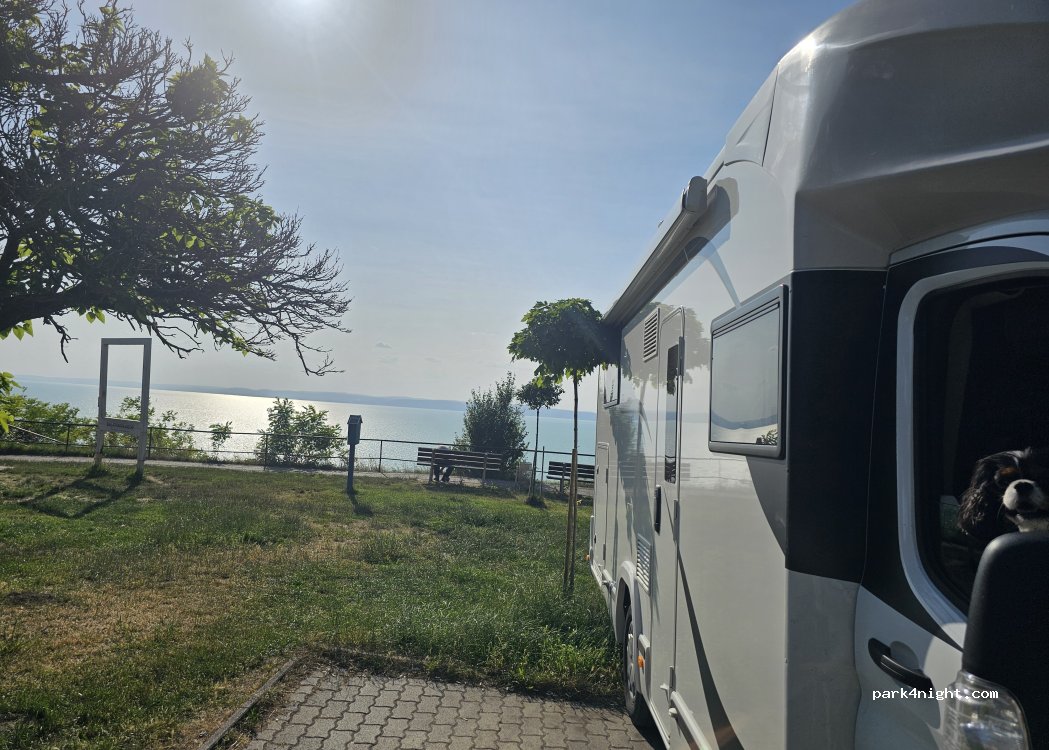 Balatonvilagos, Tancsics Mihaly u. Parking public gratuit, 20 mètres d'eau potable gratuite. Très belle vue sur le lac Balaton avec un panorama magnifique. Beau parc vert long.