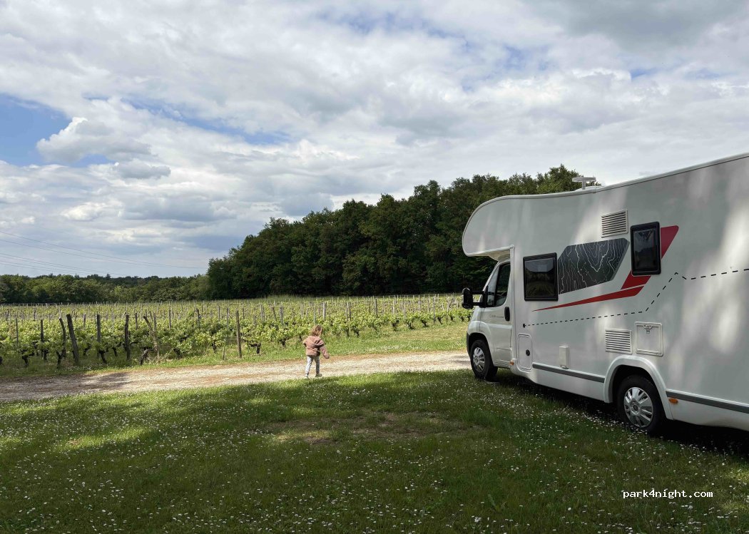 Super aire au milieu des vignes, très accueillant même à 21h30. On nous fait sentir très à l'aise, nous propose l'électricité gratuitement, table de pique-nique, wc, super aire de jeux. Nous souhaitions acheté du vin, et elle nous a gentiment ouvert sa cave à 21h30 avec dégustation, explication. Il y a une visite des vignes en petit train, avec dégustations. Je recommande.