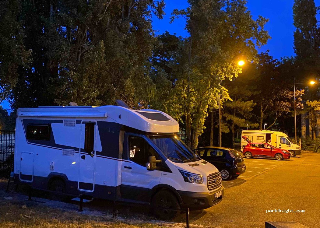Aparcament de cotxes en zona esportiva, no places especials per autocaravana però si no està ple en algunes s'hi pot aparcar bé. Lloc tranquil. Centre ciutat a 20 Min caminant, també carril bici i parada del tramvia al costat. Hem aparcat de dia i hem pernoctat sense problemes.