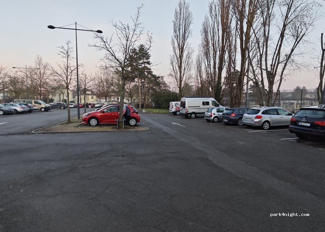 Parking of the sports centre of Mulhouse. Quiet and shady, tram stop 5 min walk, mini golf, skate park, swimming pool.