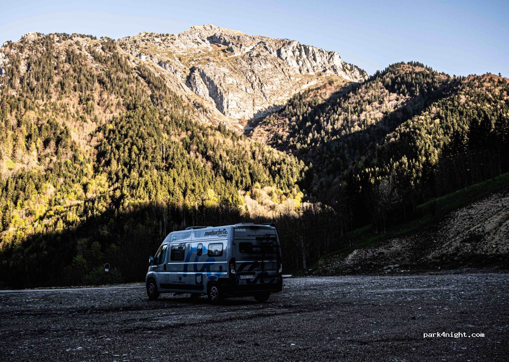 Riesiger Schotterplatz, absolut ruhig, Platz ist eben. Gigantisches Bergpanorama am Morgen. Man darf hier nur während der Schneesaison nicht übernachten. Ansonsten erlaubt und völlig unproblematisch. Zufahrt ebenfalls gut, auch mit Wohnmobil.