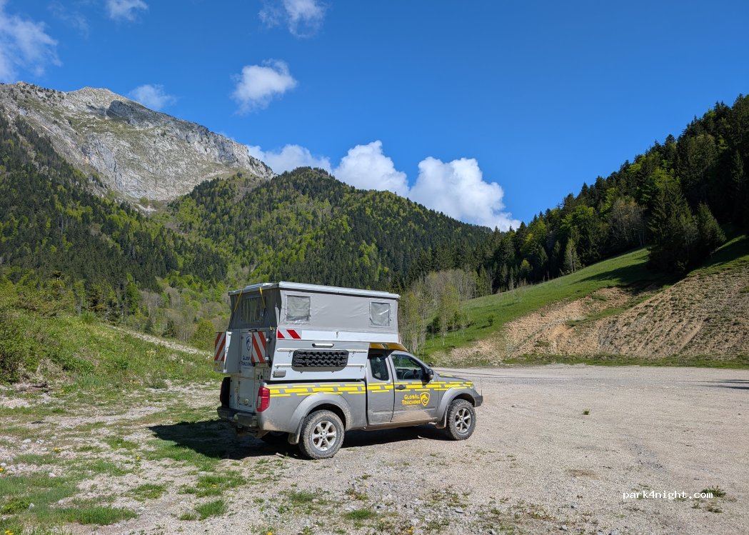 Plusieurs zones possible, grand parking en dessous du télésiège, petite zone plate au niveau du télésiège et possibilités également pour les vans de stationner un peu plus haut en suivant la piste.
