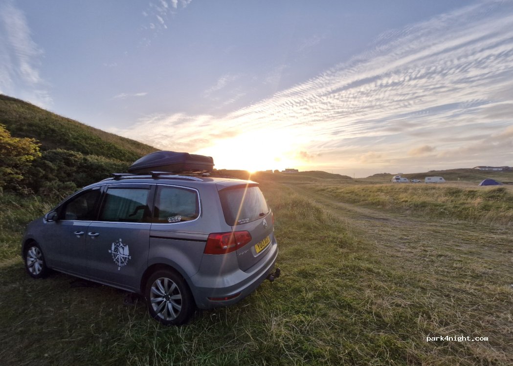 Des possibilités infinies le long de cette baie directement dans l'herbe (attention à ne pas vous garer trop proche de l'eau pour ne pas vous y retrouver en cas de glissement de terrain). Une jolie plage, même si l'eau est un peu fraîche pour s'y tremper les pieds, c'est faisable! En hors saison (début novembre) c'était super calme. Bel endroit!
