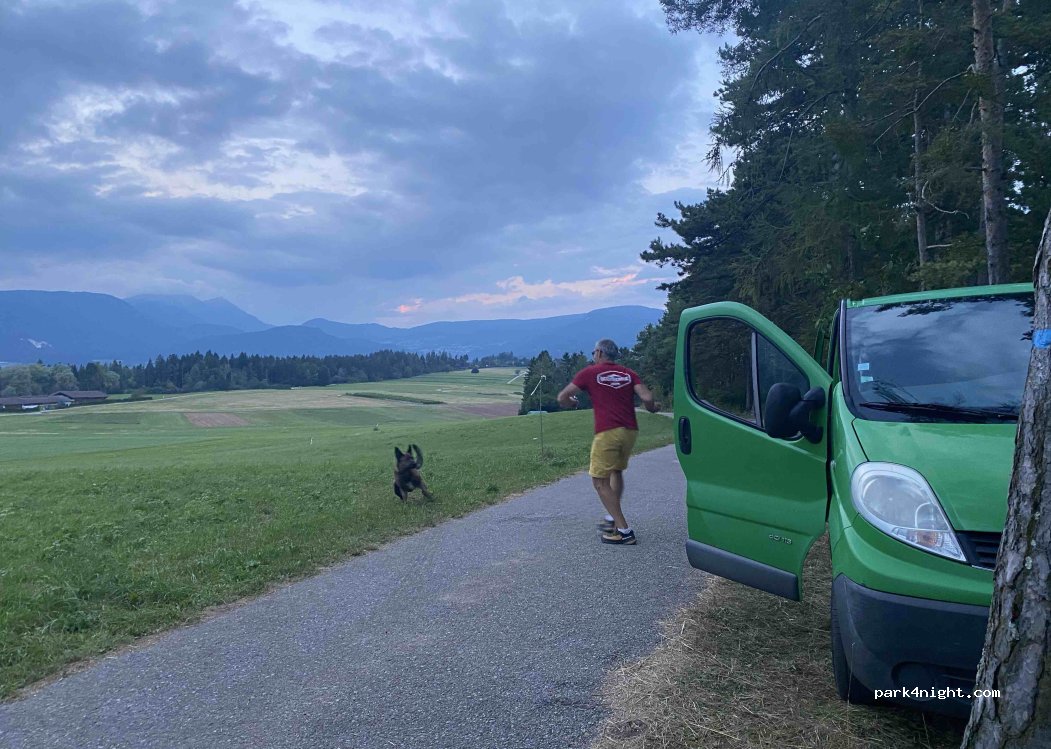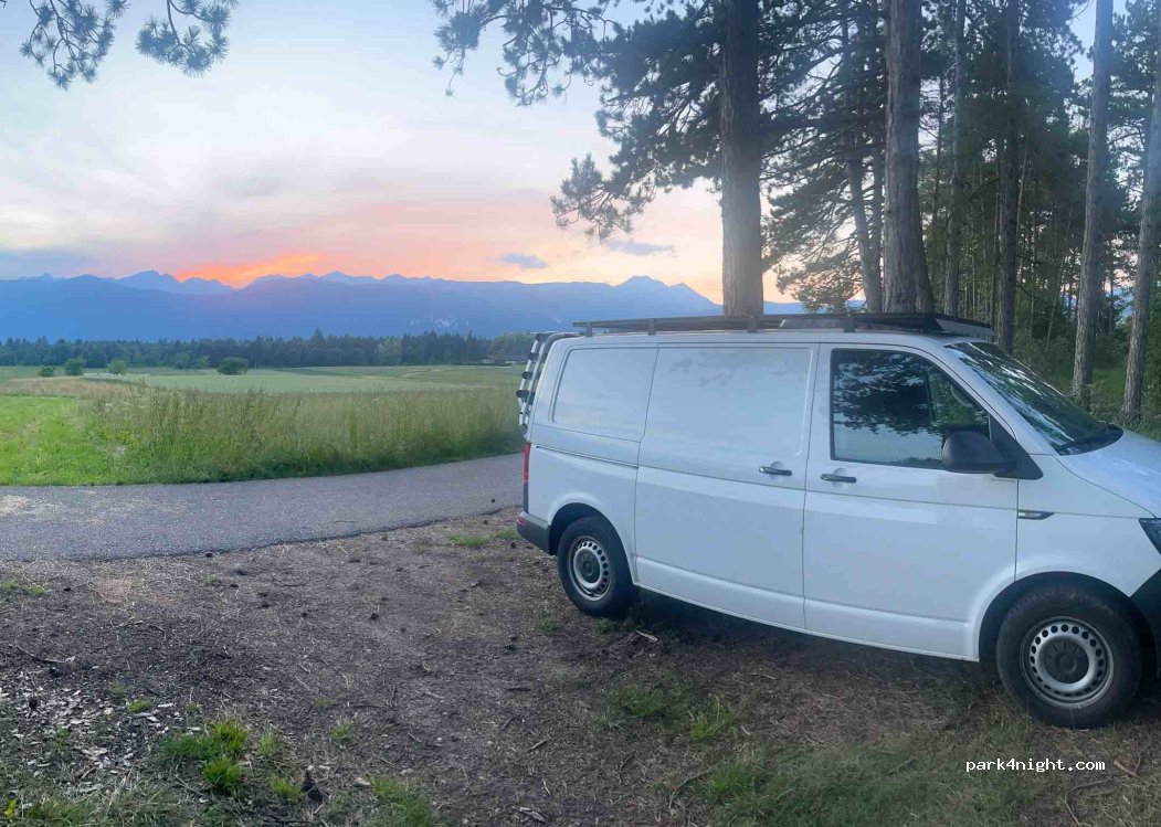 Spot idéal pour y passer la nuit calmement : proximité avec l’aire de jeu non dérangeante (spot assez éloigné), vue panoramique sur les montagnes et les champs. Nous avons pu nous recharger en eau le soir à la fontaine à quelques mètres. Attention aux moustiques qui s’invitent dans le van le soir mais mis à part ça, super spot ! Je recommande ?