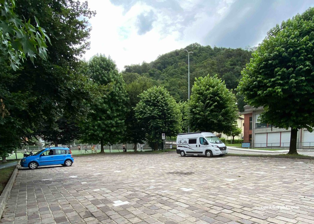 Grasveld aan de waterkant. Gesloten voor de wekelijkse markt op vrijdag van 7.00 tot 15.30 uur. Gratis openbare parkeergelegenheid direct achter het Alpini-monument. Zeer rustig, naast de beek en dicht bij een geweldige bar/piadineria. Er is ook een voetbalveld dat wordt beheerd door de eigenaar van de bar. Supermarkt en apotheek ook vlakbij. Geschikt voor korte stops.