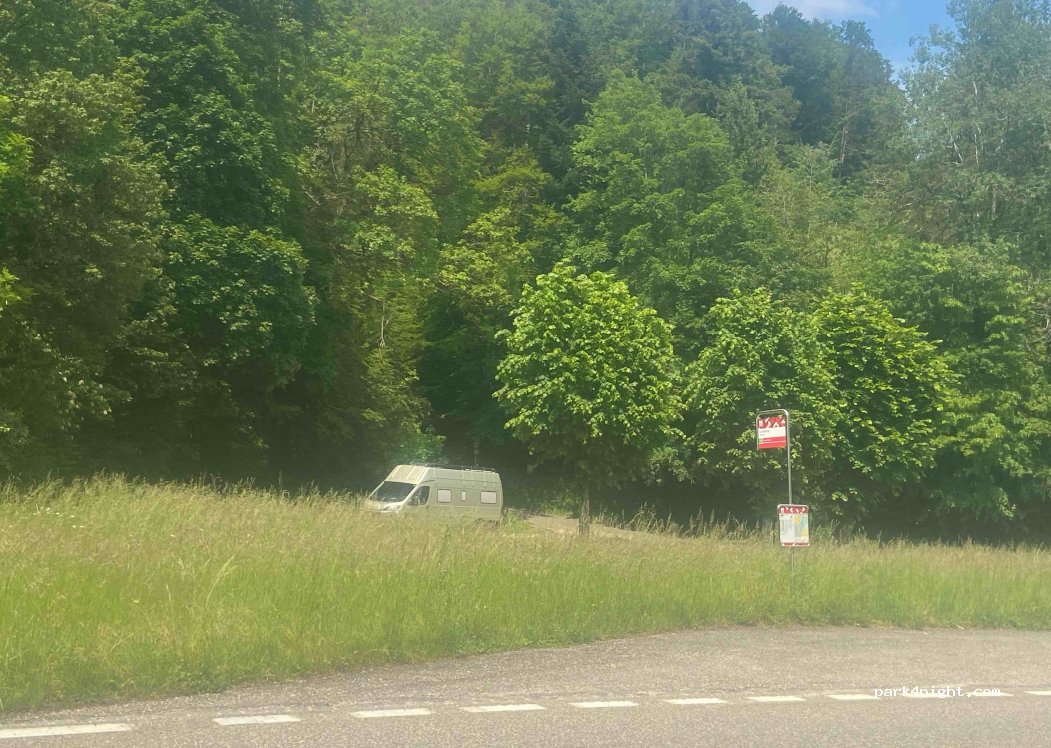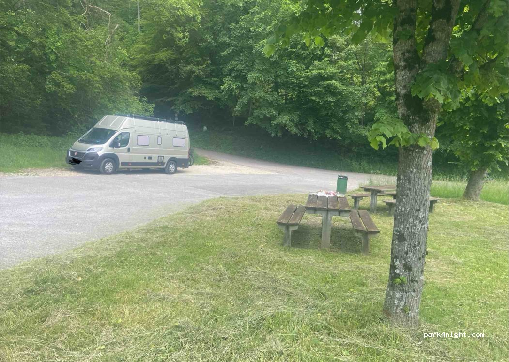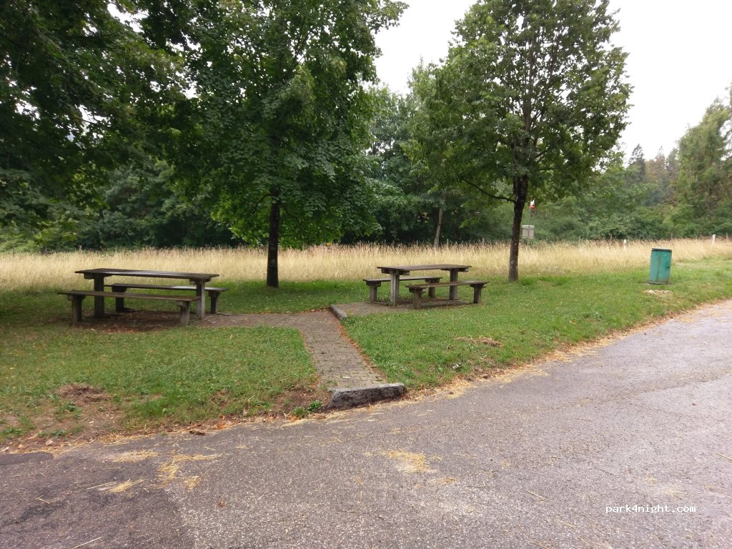 Picnic area with 2 tables, but roadside, possibility to stay to sleep, but the road remains frequent even at night