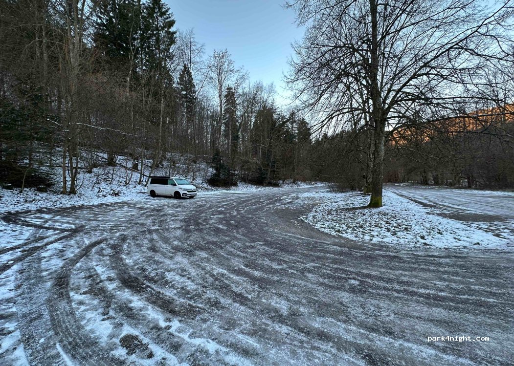 Großer Wanderparkplatz, in der Früh kommen einige Gassigeher, die stört es aber nicht. Wir haben eine ruhige Nacht verbracht, relativ eben, Mülleimer ist vorhanden.