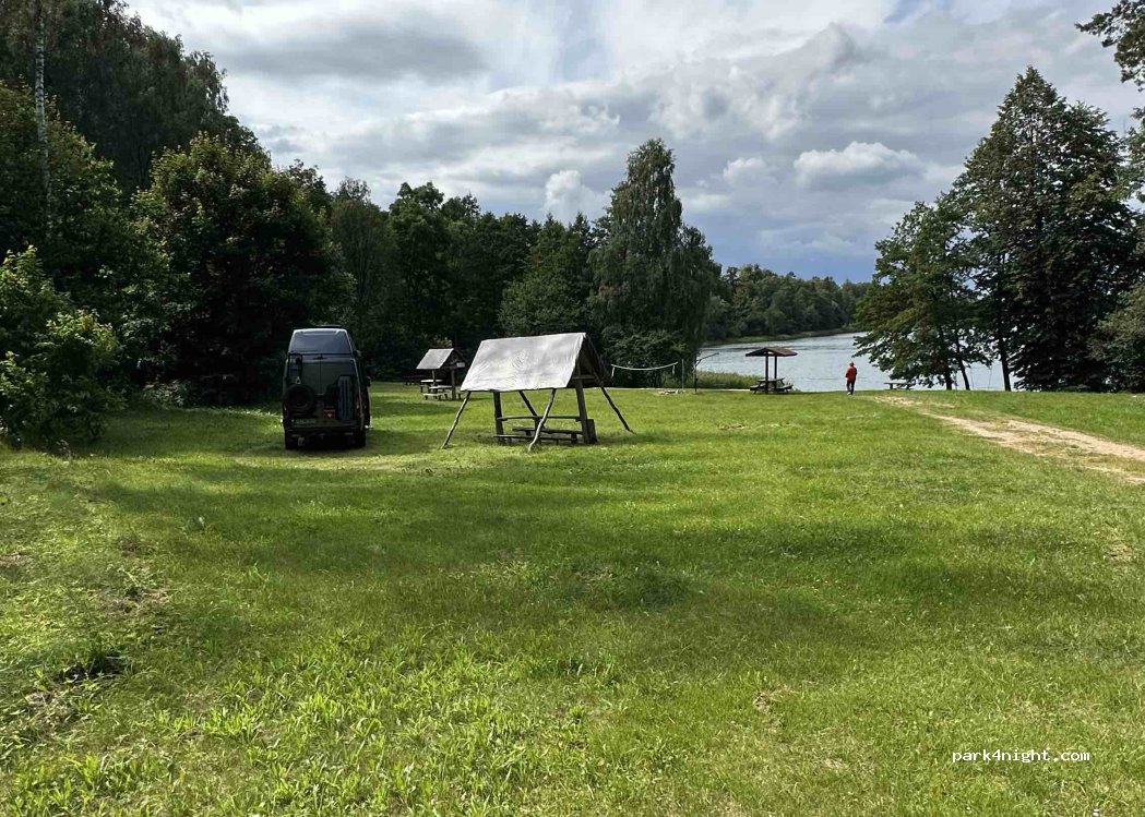 Bivouac right on the lake, tables, benches, a water pump, outhouse Quiet, forest around it, a paradise. Only for buses and vans, 300m sandy track.