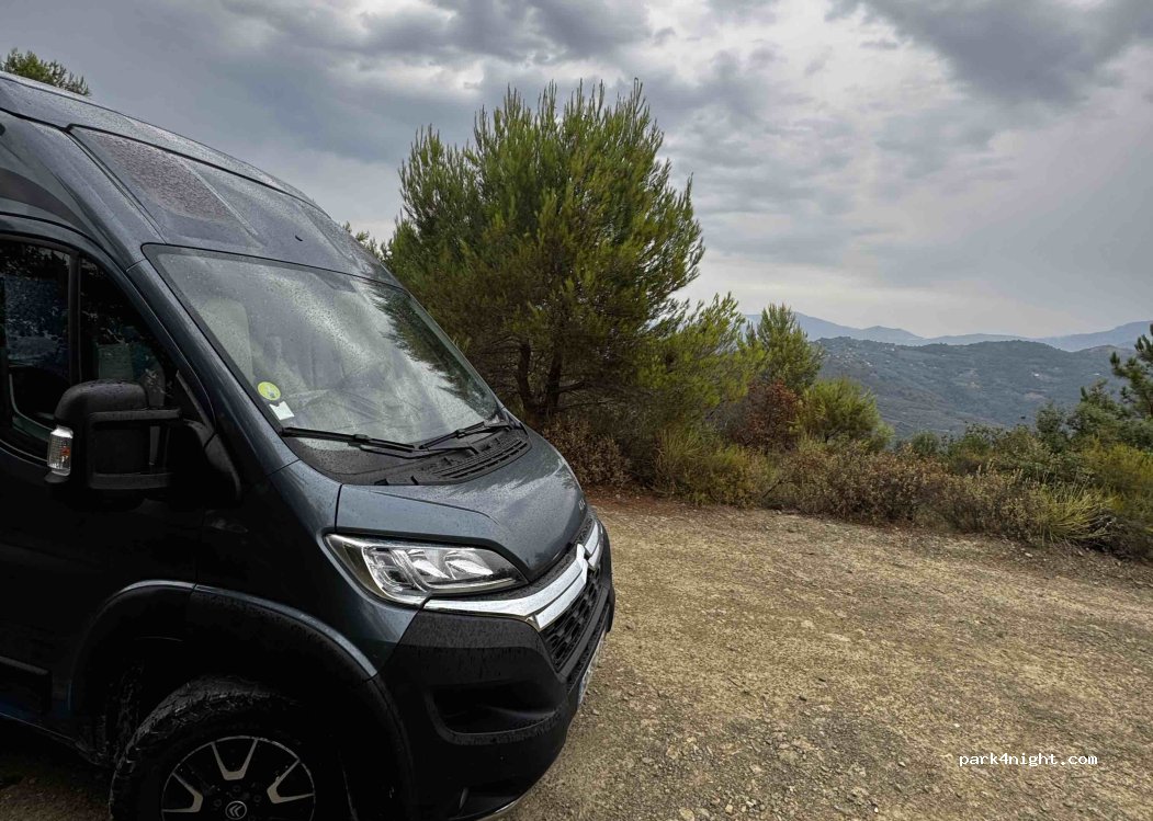 En pleine cambrousse et avec vue dégagée ! On a un peu avancé par rapport au point GPS indiqué. On n'a pas croisé âme qui vive une fois garés. Déjà 2 vans en arrivant mais on a trouvé plus loin. Des aboiements de chien toute la nuit sur la colinne d'en face (lointain donc, moi j'ai dormi nickel mais ça a gêné mon mari). Prévoir bien 20 min de petite route de montagne pour y accéder.