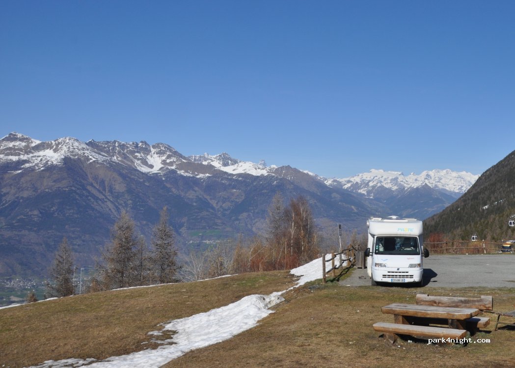 Populär parkering med fantstisk utsikt över Aostadalen. Dock är parkeringen inte jämn, men utsikten väger upp. Lekplats, vatten och bord med bänkar. Restauranger, en liten matbutik och liftar precis i närheten.