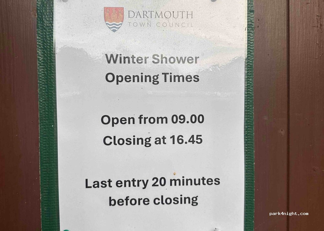 Amazing park for the night! As it's coming into winter we had no troubles parking as the 2hr limit is only from May-Sept, I think you could stay a few nights if you wanted. Dartmouth is a little off the A38 but an absolutely beautiful town well worth the visit. Toilets and showers open from 8am Mon-Sat and from 10am on Sun. Toilets are 20p and showers £1. Views of the marina are spectacular!