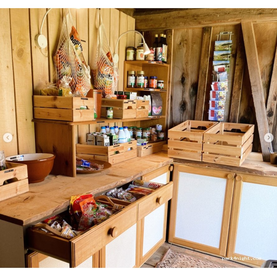 Bike washing station, igloo sauna, unique tiny homes to rent, restaurant, shop, many power connections, bread delivery service.