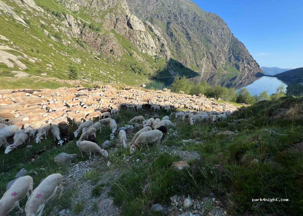 Nous avons passé la nuit un peu plus bas, le long de la route, face au lac. Spot génial : un peu de passage jusqu’à 22h, puis à nouveau vers 6h. Vous croiserez les bergers en transhumance vers 9h. Je recommande !
