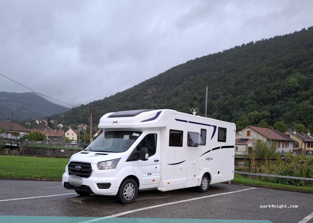 Parking assez spacieux, rarement rempli, proche de l'entrée du village avec quelques maisons et entreprises (d'ailleurs pour les VW, il y a un garage spécialisé juste à côté). À quelques mètres, une rivière et la piste cyclable toute proche. En bord de route, mais pas trop passante. Il y a même une cabine de téléphone transformée en bibliothèque, libre service!