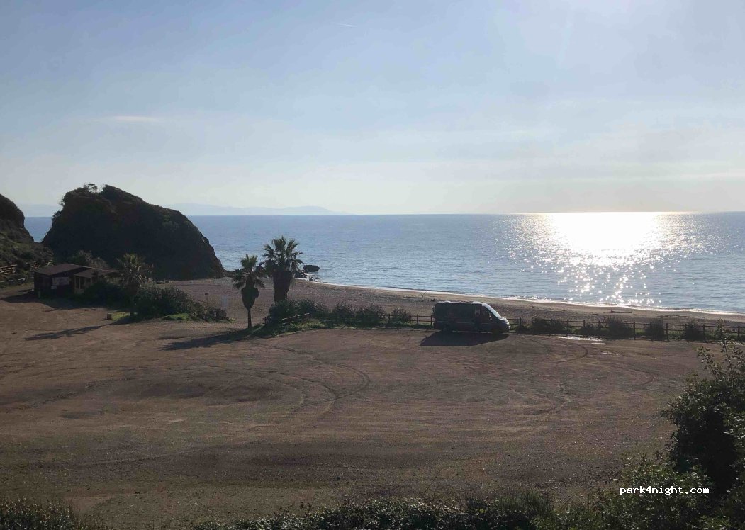 parcheggio della spiaggia, accesso facile dalla strada sterrata anche per camper di grandi dimensioni. Isolato, il ristorante d'inverno è chiuso. al mattino si vede l'alba nascere dal mare. nessun servizio.