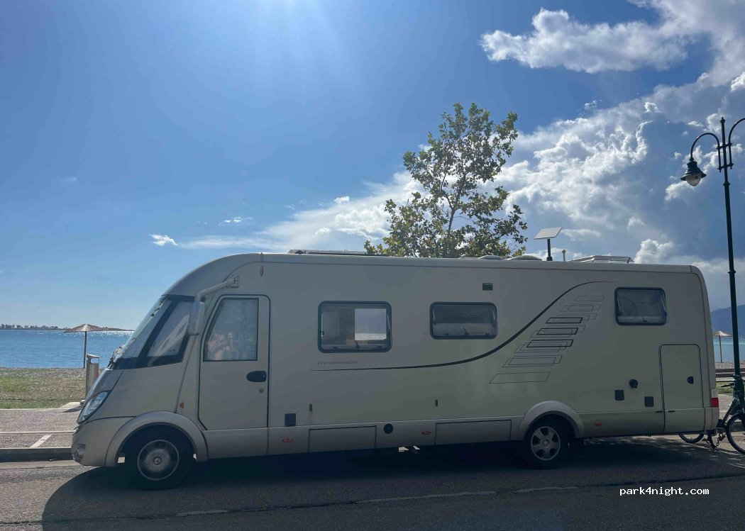 Wir haben 3 Nächte hier an der Strandstrasse geschlafen. Für Griechenland sehr sauberer Strand, trotz vielen netten Spattziergänger.Schönes Städtchen. 300 Meter von hier stadtwärts, ist eine gute und günstige Holzofenpizzeria, wo man in 10 Minuten, eine ausgezeichnete Pizza oder Pasta mitnehmen kann. Polizei fährt oft vorbei, und schaut, dass es uns gut geht und alles sauber bleibt. Wasserhahnen am Boden zwischen den Bäumen, damit Duschen und Zapfhahnen funktionieren. Mehrere Container am Strassenrand.
