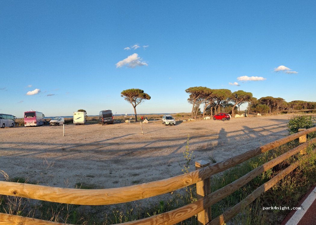 Ci siamo fermati una notte in questo parcheggio sterrato. Posto tranquillo e parcheggio, a maggio 2025, non a pagamento. Ottimo sopratutto per chi ha cani perché c'è oltre allo spiaggione una lunga pinetta dove passeggiare. Nel parcheggio non ci sono servizi per i camper ma nella spiaggia sono presenti due chioschi entrambi aperti