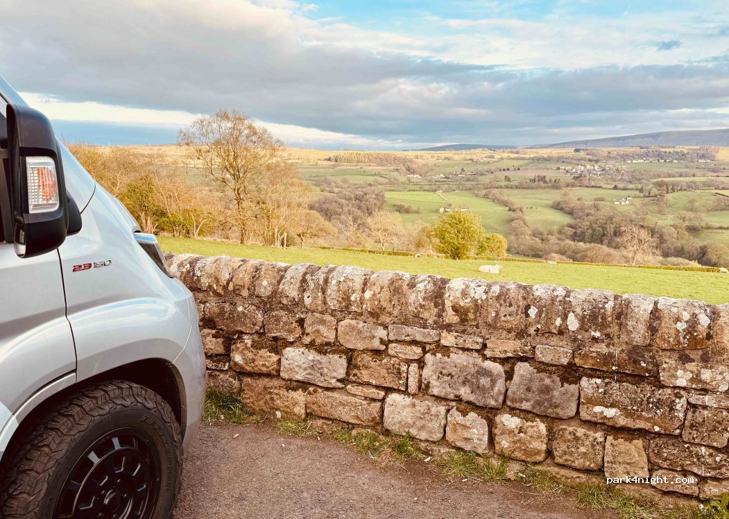 Wonderful spot with stunning views out across the valley to Pennines. A bin is the only service as such, but the road is quiet, ensuring a safe passage through the night. Ideal stopover if heading to or from Scotland. There were four others overnighting in mid- August. Big rec from us. Safe.