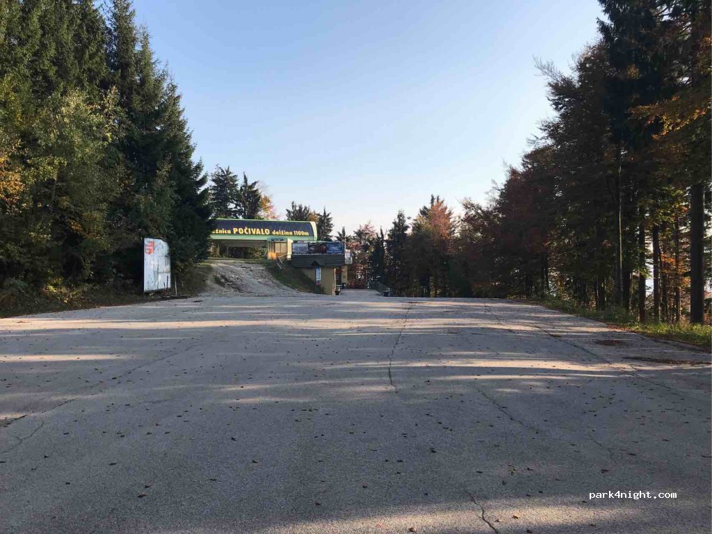Parkplatzeinfahrt zum Ski- und Bike&Funpark Cerkno, nachts sehr ruhig