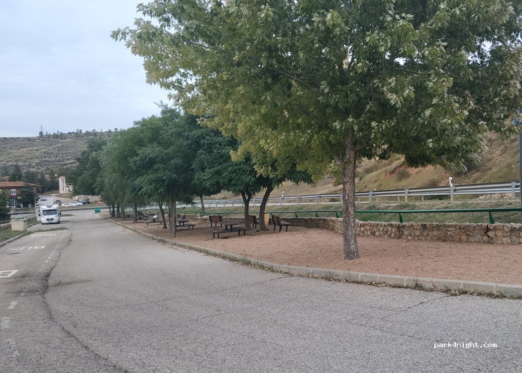 Muy buen acceso desde la nacional, con agua mesas y árboles, de día ruido de tráfico, de noche tranquila y sin tráfico. El área de autocaravanas está a 450 m., pero estaba llena y están muy acosados. Hemos dormido dos noches muy agusto. Ideal la ubicación para visitar el castillo y a poca distancia del centro urbano. Está un tanto desnivelado, pero con AC de 7,20 aparcamos en línea y nivelamos.