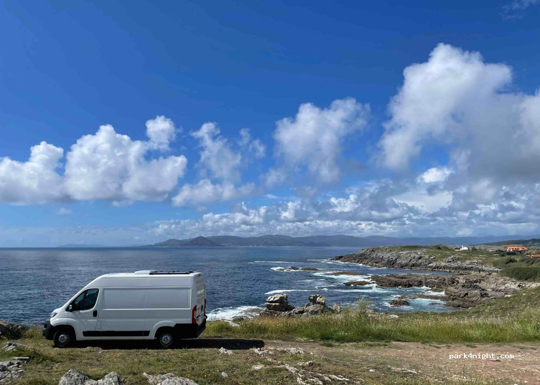 El camino se bifurca casi al final, con dos posibles sitios: uno pequeño y mas abrigado, donde caben unas 2 furgonetas, y otro más expuesto pero con mejores vistas y con más sitio. Nosotros hemos estado en el segundo. Es un “mirador”, asi que había movimiento con la puesta de sol, pero por la noche hemos estado solos. Muy tranquilo, solo se oye el mar, los pesqueros, y alguna moto por la carretera. Estaba muy limpio, asi que NO DEJEIS BASURA NI PAPEL HIGIENICO, PORFAVOR.