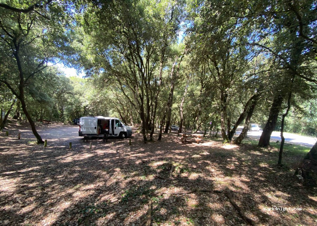 Aire de la Gillard, coin bien ombragé avec des tables de pique-nique. Fréquenté la journée selon les places disponibles. Plage à 1 km par la forêt et divers sentiers pour la course, VTT. Réseau 4G sans souci.