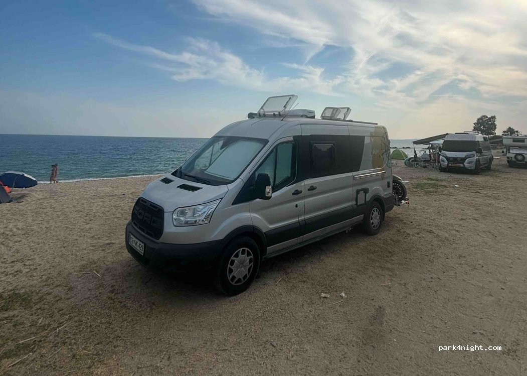 Next to Beach Bar we easily stayed for 2 nights with our camper in first row by the beach. Campers come and park/stay here daily, I would say there is enough place at least for 6-8 campers. Bar is opened late but we didnt find music to loud to sleep. During day lots of daily visitors come to swim but beach was empty in the evening (we stayed there on weekdays at the end of June).